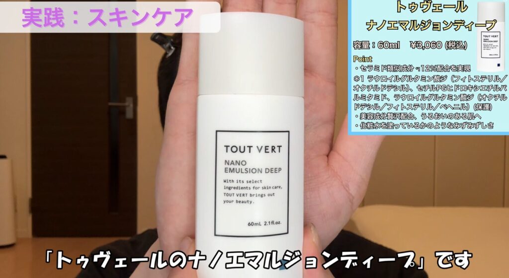 そして、乳液は「トゥヴェールのナノエマルジョンディープ」を使います。乳液なのに化粧水のようにシャバシャバして使いやすいのに、セラミドなどが配合されていてしっかり保湿することができるアイテムです。