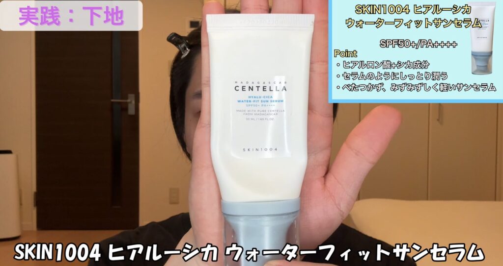 次に、日焼け止め兼下地として「SKIN1004のヒアルーシカ ウォーターフィット サンセラム」を使います。