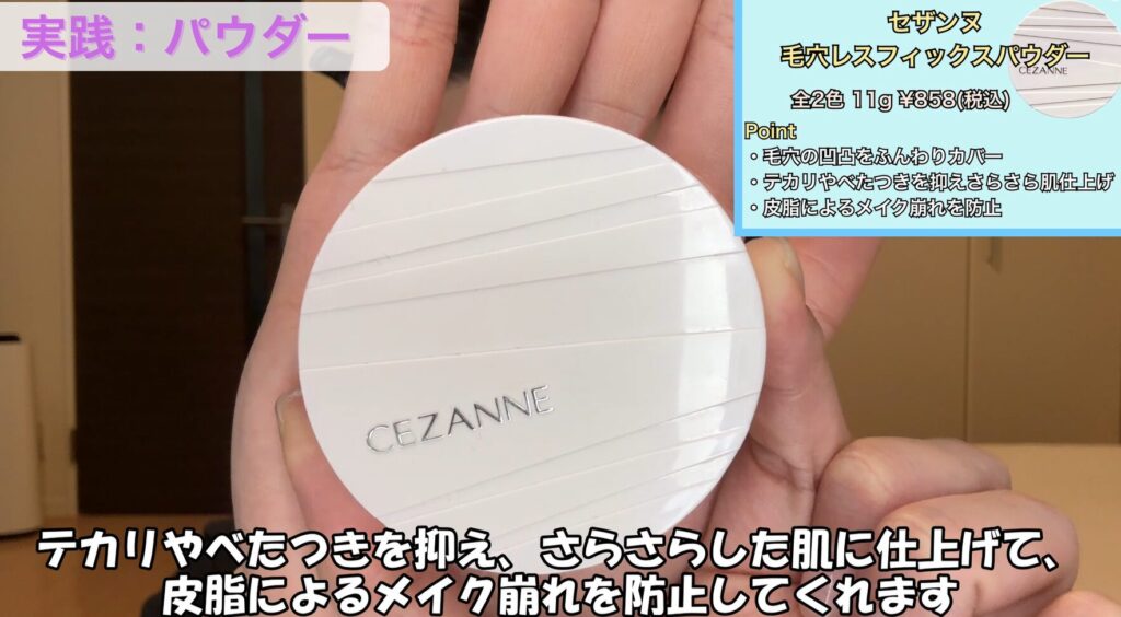 最後にパウダーをのせますが、 ここでは「セザンヌの毛穴レスフィックスパウダー」を使います。