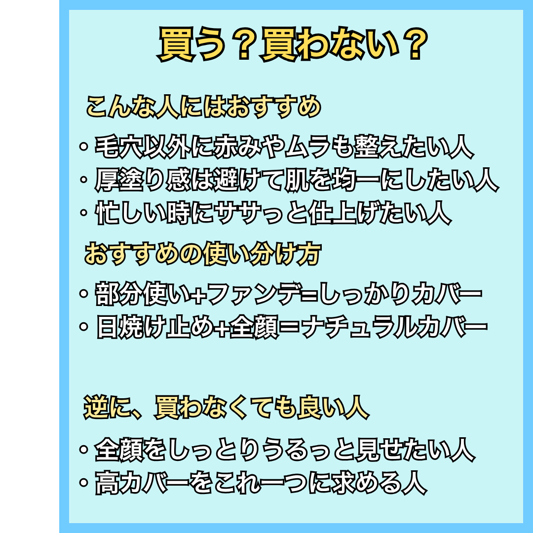 毛穴を自然にぼかしたい人、赤みやムラも一緒に整えたい人、サラッと簡単に使いやすいアイテムを探している人にとっては、とてもいいのかなと思います。