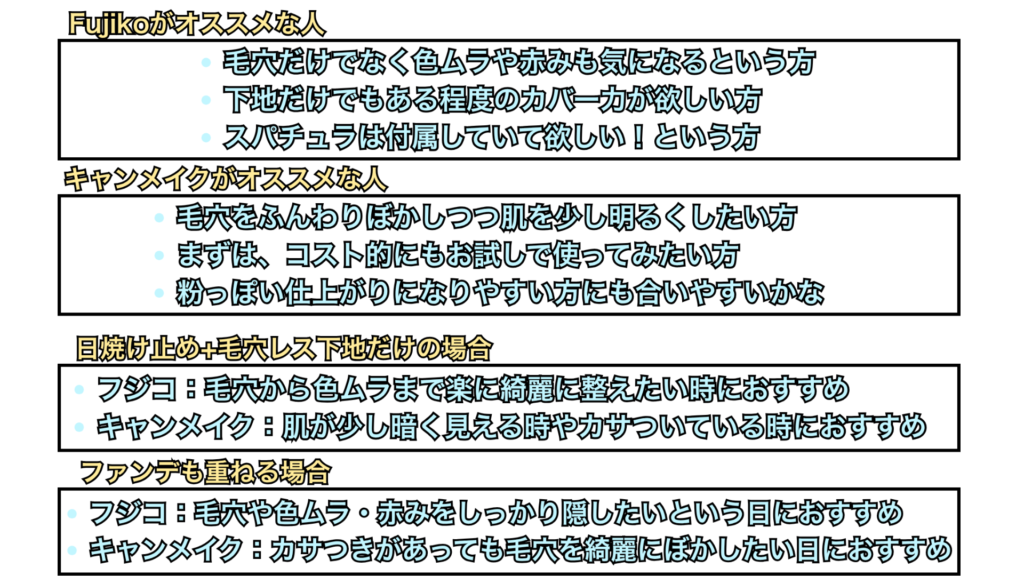 今回は、スフレ状の毛穴レス下地として「フジコの毛穴おだまりクリームとキャンメイクのポアレスエアリーベース02」を比較検証していきます。