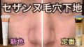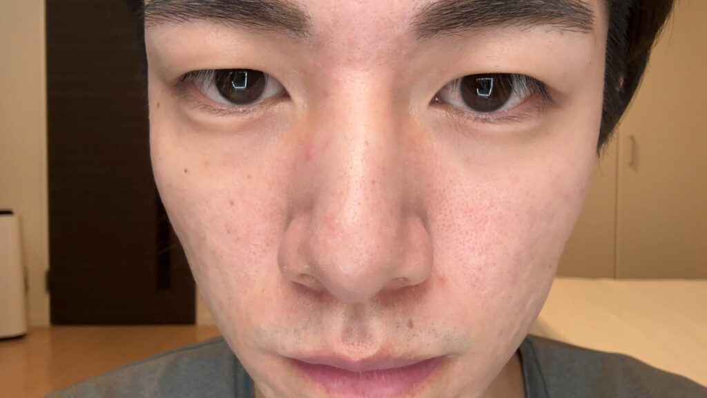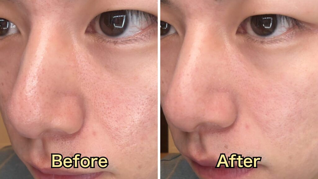 鼻廻りはちょっと掻いたり鼻を噛んだりしているので、さすがにどちらも落ちていて皮向けや粉っぽくなっています。そして小鼻の横はどちらも溜まっている感じが出ていますが、