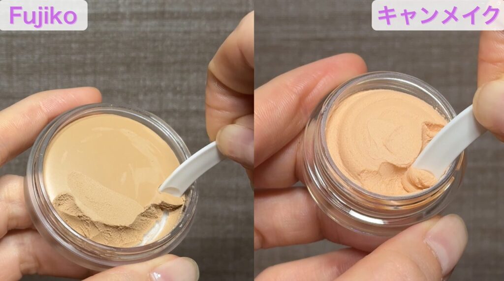 キャンメイクの方は、成分構成に水が配合されているからか、水分感のある質感で肌に馴染んでさらさらになる直前まで粘性を感じながら伸びます。一方で、フジコは早い段階でさらさらになって肌に馴染みます。