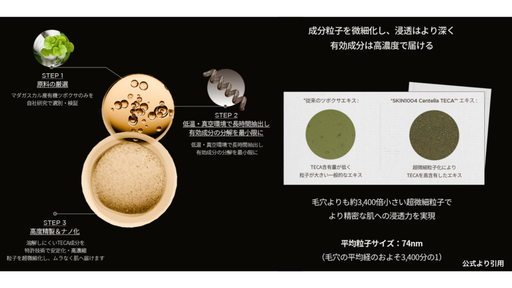 今回のTECAラインでは、マダガスカル産の有機ツボクサのみを選別・検証し、成分の分解を最小限にするため低温・真空環境で長時間抽出して、溶解しにくいTECA成分を特許技術により安定化・高濃縮・そして粒子を超微細化し、ムラなく肌へ届けてくれます。