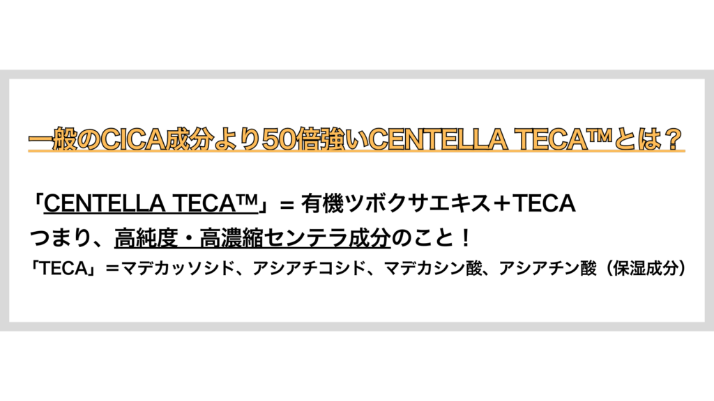 この「CENTELLA TECA™ 」って一体どんな成分ですか?というところですが、こちらは有機ツボクサにSKIN1004独自の工法で抽出したTECAを配合した、高純度・高濃縮センテラ成分のことで、一般的なシカ抽出物比最大50倍のTECA含有量を叶えたとのことです。